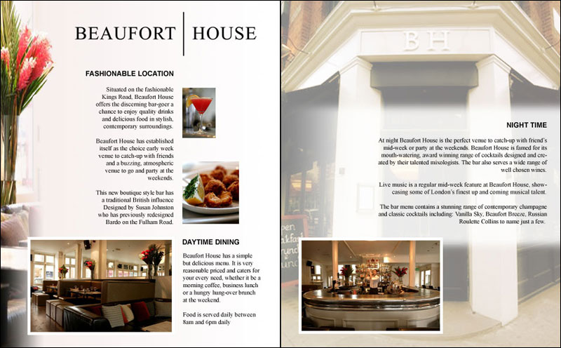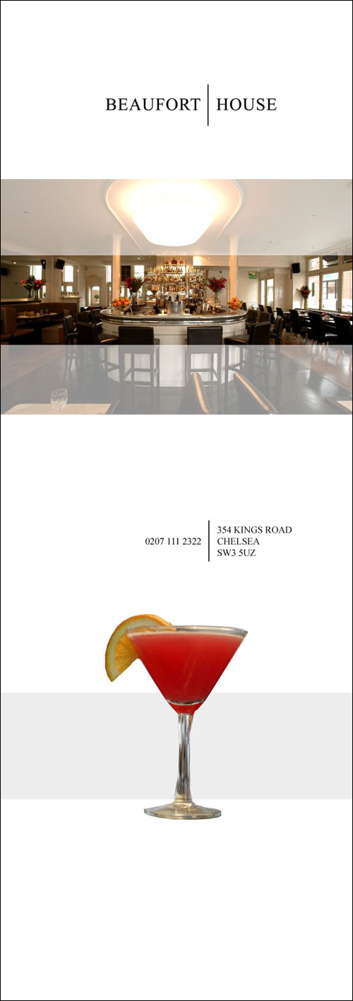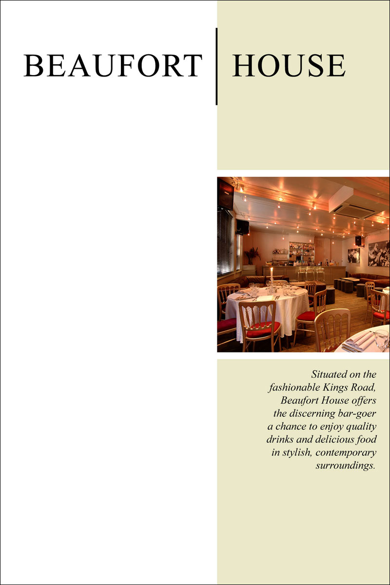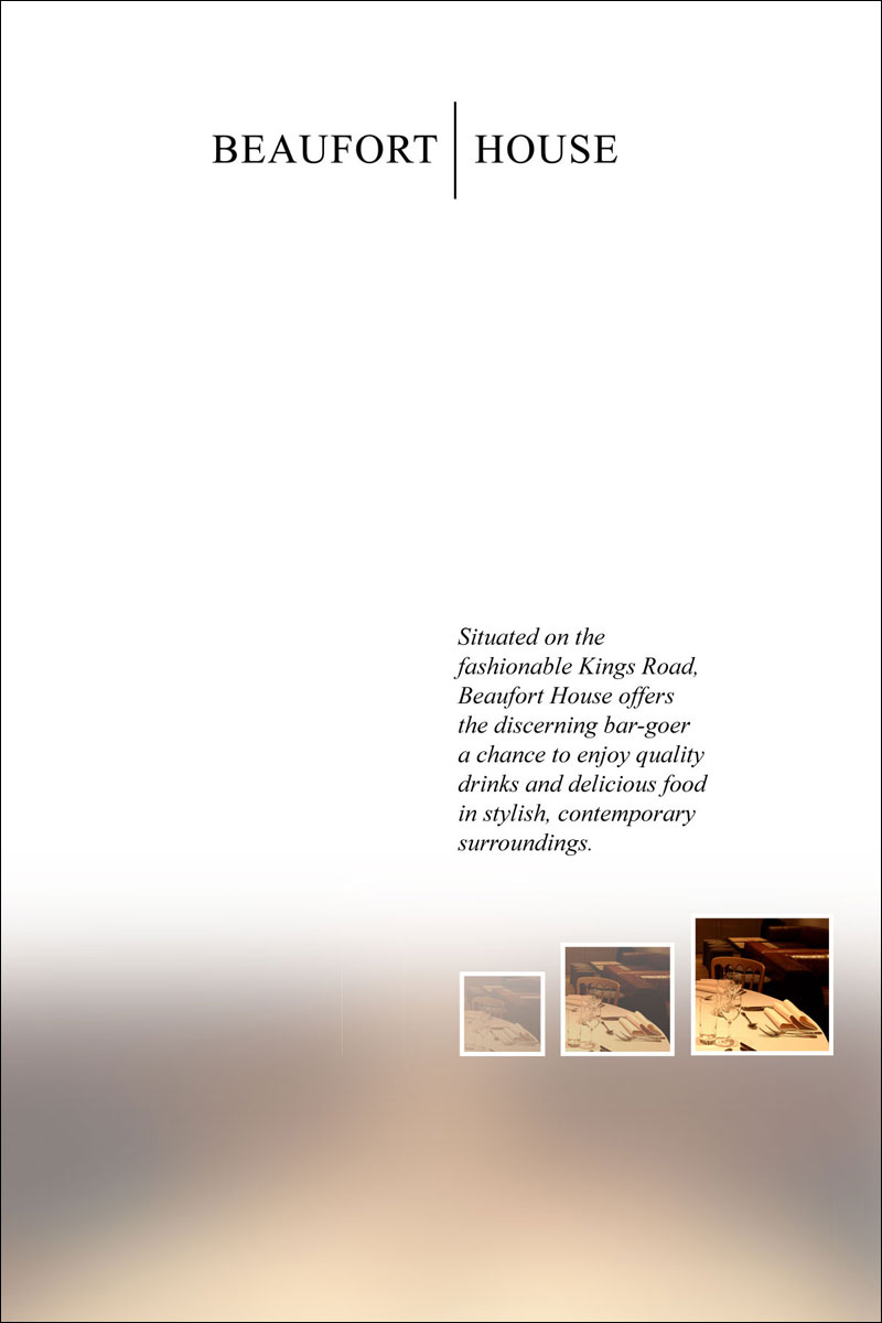 These sample designs were created for brochures, flyers and presentation folders for the Chelsea bar & brasserie. You can click each of the images below to open up a larger version of the design in a new window.