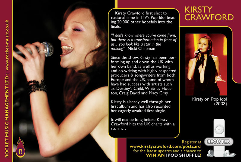 These postcard designs were designed to promote Kirsty Crawford at a series of 18 live venues across the UK as part of a full UK tour.